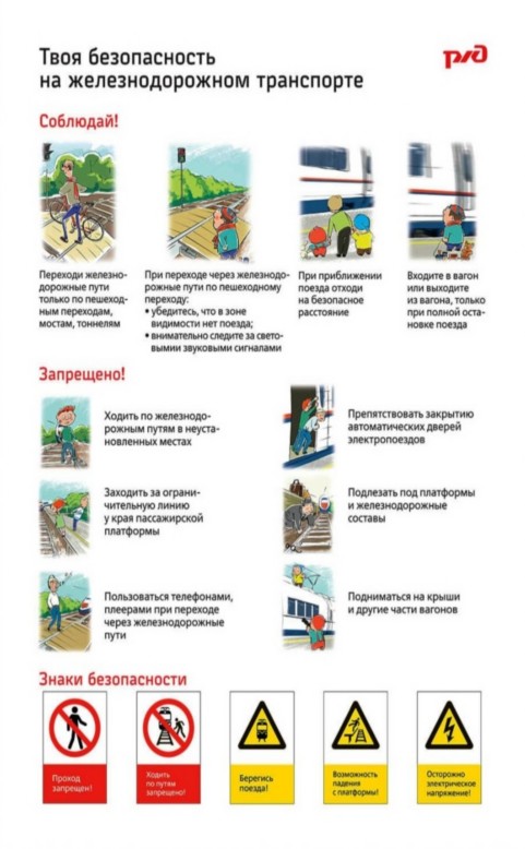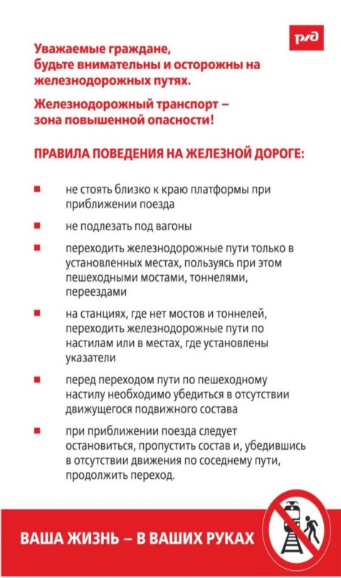 Помните, что железная дорога – не место для игр. Не катайтесь по платформе на велосипеде, скейтборде и роликах - ЭТО ОПАСНО ДЛЯ ЖИЗНИ! Приближаясь к железной дороге – снимите наушники – в них можно не услышать сигналов поезда! Никогда не переходите железнодорожные пути в местах стрелочных переводов. Поскользнувшись, можно застрять в тисках стрелки, которая перемещается непосредственно перед идущим поездом. Опасайтесь края платформы, не стойте на линии, обозначающей опасность! Оступившись, вы можете упасть на рельсы, под приближающийся поезд. Берегите себя!